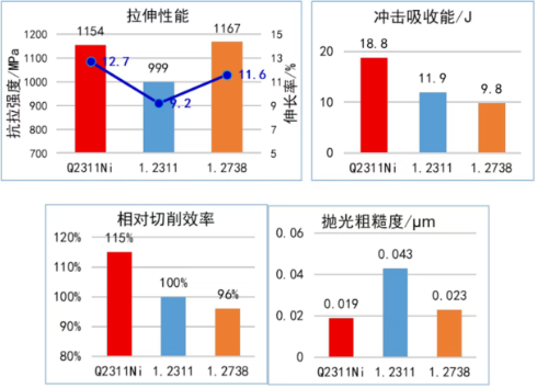Compared with 1.2311 and 1.2738, Q2311Ni shows significant improvements in plasticity and toughness, machining efficiency, polishability, and mechanical properties: