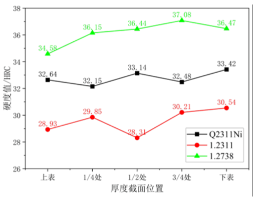 Note: The greater the plate thickness, the more pronounced the cross‑section hardness difference in 1.2311 and 1.2738, while Q2311Ni maintains a uniform distribution.