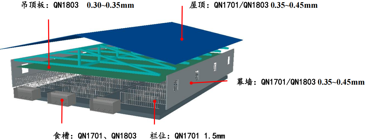 Outdoor roofing is primarily subject to atmospheric corrosion; ceiling tiles, railings, curtain walls, and troughs are in contact with the farm environment, where corrosion is more severe. Using QN series stainless steel can significantly slow down the corrosion rate.