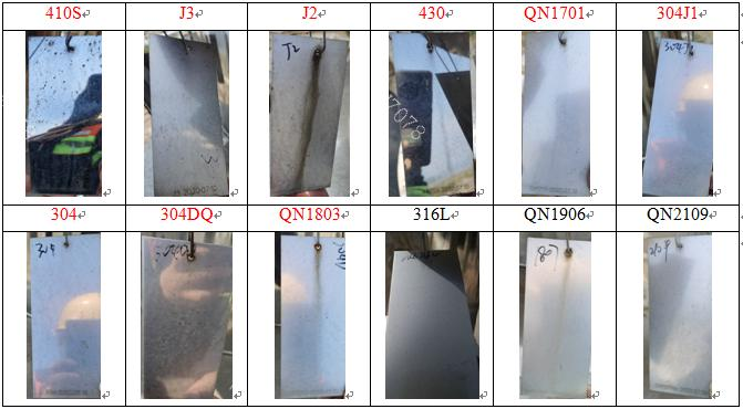 Marine atmospheric environment (5 months) coupon photos: 410S, J3, J2 showed significant rust after two weeks; 430 showed slight rust spots after one month; after 3 months, QN1701, 304J1, 304, 304DQ, QN1803 all showed a few rust spots; 316L, QN1906 and higher grades did not rust.