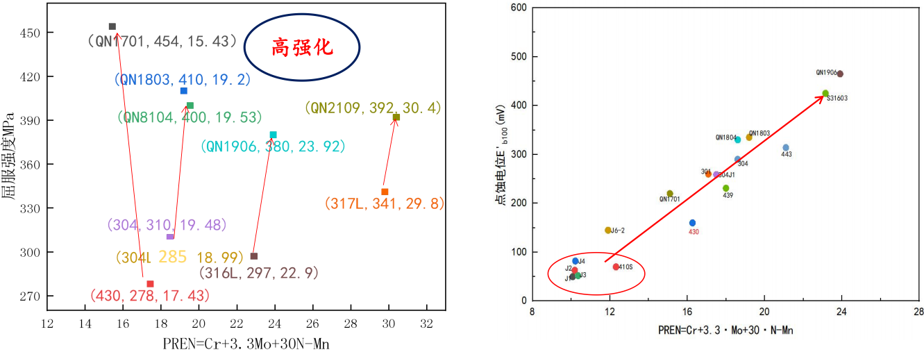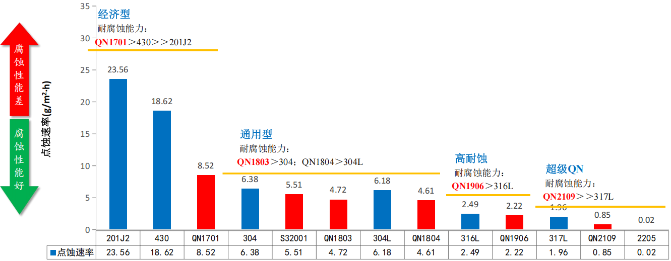 Compared to benchmarked grades, QN series steels ensure equivalent or higher Cr content and higher N content. Despite the reduction in nickel, QN series steels still achieve a higher PREN value, ensuring superior corrosion resistance.